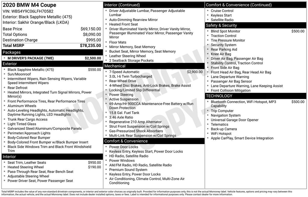 16 Speakers, 4-Wheel Disc Brakes, ABS brakes, Active Blind Spot Detection, Adaptive suspension, Advanced Real-Time Traffic Information, Air Conditioning, Alloy wheels, AM/FM radio: SiriusXM, Apple CarPlay Compatibility, Auto-dimming door mirrors, Auto-dimming Rear-View mirror, Automatic Start/Stop Function, Automatic temperature control, BMW Assist eCall, BMW TeleServices, Brake assist, Bumpers: body-color, CCC Contribution, CD player, Cloth/Leather Upholstery, ConnectedDrive Services, Delay-off headlights, Driver door bin, Driver vanity mirror, Dual front impact airbags, Dual front side impact airbags, DVD Area Coding (North America), DVD-Audio, Electronic Stability Control, Emergency communication system: BMW Assist eCall, Enhanced USB & Bluetooth, Exterior Parking Camera Rear, Four wheel independent suspension, Front anti-roll bar, Front Bucket Seats, Front Center Armrest, Front dual zone A/C, Front reading lights, Fully automatic headlights, Garage door transmitter, Hands-Free Bluetooth & USB Audio Connection, harman/kardon Surround Sound System, harman/kardon® Speakers, HD Radio, Heated door mirrors, Heated Front Seats, Heated front seats, Heated Steering Wheel, Illuminated entry, Increased Top Speed Limiter, Instrument Cluster w/Extended Contents, Knee airbag, Leather Shift Knob, Leather steering wheel, Low tire pressure warning, Lumbar Support, M Driver's Package, Memory seat, Moonroof, Navigation System, Occupant sensing airbag, Outside temperature display, Overhead airbag, Panic alarm, Passenger door bin, Passenger vanity mirror, Power door mirrors, Power driver seat, Power Front Seats, Power passenger seat, Power steering, Power windows, Radio Control US, Radio data system, Radio: AM/FM Audio System, Rain sensing wipers, Rear anti-roll bar, Rear reading lights, Rear seat center armrest, Rear window defroster, Remote keyless entry, Remote Services, Security system, SiriusXM Satellite Radio, Speed control, Speed-sensing steering, Speed-Sensitive Wipers, Split folding rear seat, Sport steering wheel, Steering wheel mounted audio controls, Tachometer, Telescoping steering wheel, Tilt steering wheel, Traction control, Trip computer, Turn signal indicator mirrors, Variably intermittent wipers, Wheels: 18" x 9" Fr & 18" x 10" Rr M V-Spoke, WiFi Hotspot, Wireless Charging.