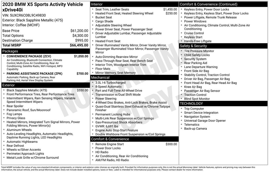 This striking 2020 BMW X5 xDrive40i offers an unparalleled driving experience with a powerful 3.0L I6 DOHC 24V TwinPower Turbo engine, delivering 20 city/26 highway MPG. Wrapped in a sleek Black exterior, this X5 exudes confidence and refinement. Step inside the luxurious cabin and discover thoughtful amenities like heated front seats, a heated steering wheel, and a panoramic moonroof that flood the interior with natural light.