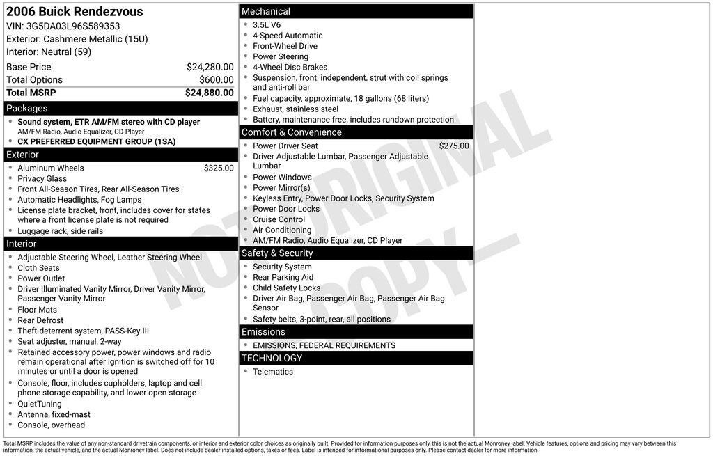 17" Aluminum Wheels, 3.29 Axle Ratio, 4-Wheel Disc Brakes, 6 Speakers, 6-Way Power Driver Seat Adjuster, Air Conditioning, AM/FM radio, Bumpers: body-color, CD player, Driver door bin, Driver vanity mirror, Dual front impact airbags, Emergency communication system: OnStar, Four wheel independent suspension, Front anti-roll bar, Front Bucket Seats, Front Center Armrest, Front fog lights, Front reading lights, Fully automatic headlights, Illuminated entry, Leather steering wheel, Occupant sensing airbag, Overhead console, Panic alarm, Passenger door bin, Passenger vanity mirror, Power door mirrors, Power steering, Power windows, Radio data system, Rear anti-roll bar, Rear reading lights, Rear seat center armrest, Rear window defroster, Rear window wiper, Remote keyless entry, Roof rack: rails only, Security system, Speed control, Speed-sensing steering, Split folding rear seat, Tachometer, Tilt steering wheel, Variably intermittent wipers.