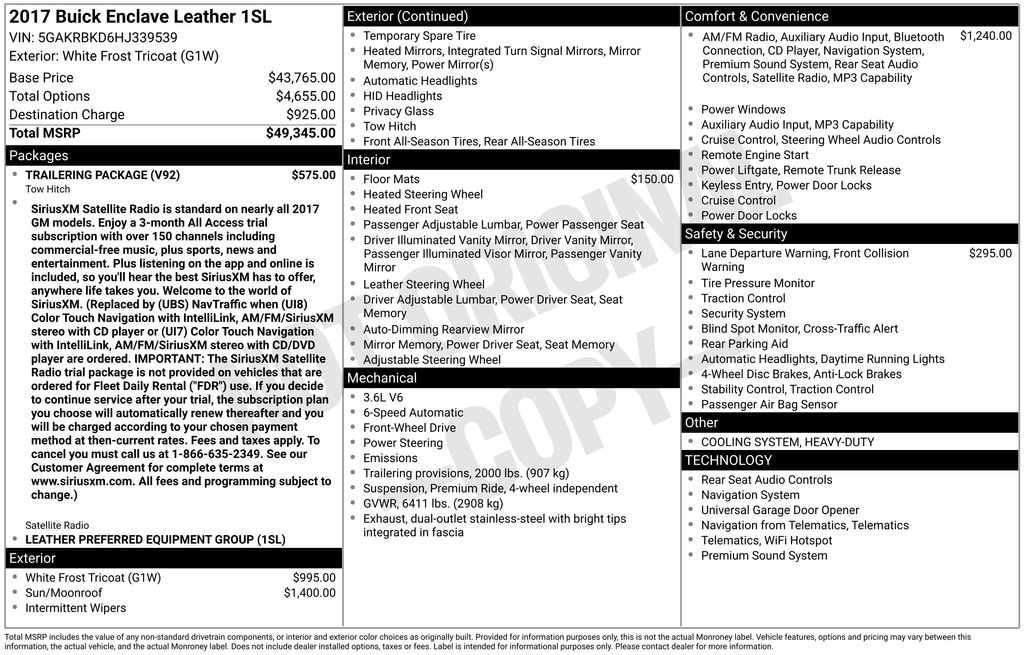 Powered by a robust 3.6L V6 engine, the Enclave delivers a smooth and responsive driving experience, whether you're navigating city streets or venturing off the beaten path. The available Trailering Package, with its heavy-duty cooling system and trailer hitch, allows you to tow up to 4,500 lbs, making it the perfect companion for your weekend adventures.