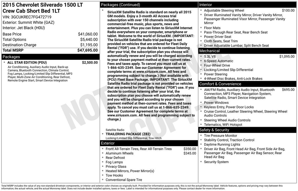 6-Speed Automatic Electronic with Overdrive, 4WD, Black Cloth, 110-Volt AC Power Outlet, All Star Edition, Dual-Zone Automatic Climate Control, Electric Rear-Window Defogger, Front Halogen Fog Lamps, Heavy-Duty Rear Locking Differential, Radio: AM/FM 8" Diagonal Color Touch Screen, Rear Vision Camera w/Dynamic Guide Lines, Remote Vehicle Starter System, SiriusXM Satellite Radio, Theft Deterrent System (Unauthorized Entry), Trailering Equipment, 10-Way Power Driver's Seat Adjuster, 150 Amp Alternator, 3.42 Rear Axle Ratio, 4-Wheel Disc Brakes, 4.2" Diagonal Color Display Driver Info Center, 40/20/40 Front Split Bench Seat, 6 Speaker Audio System, 6 Speakers, ABS brakes, Air Conditioning, Alloy wheels, AM/FM radio: SiriusXM, Auxiliary External Transmission Oil Cooler, Bluetooth® For Phone, Body Color Bodyside Moldings, Body Color Door Handles, Body-Color Mirror Caps, Body-Color Power Adjustable Heated Outside Mirrors, Bodyside moldings, Brake assist, Bumpers: chrome, CD player, Cloth Seat Trim, Color-Keyed Carpeting w/Rubberized Vinyl Floor Mats, Compass, Deep-Tinted Glass, Delay-off headlights, Driver & Front Passenger Illuminated Vanity Mirrors, Driver door bin, Driver vanity mirror, Dual front impact airbags, Dual front side impact airbags, Electronic Stability Control, Emergency communication system: OnStar Directions & Connections, EZ Lift & Lower Tailgate, Front anti-roll bar, Front Center Armrest w/Storage, Front Chrome Bumper, Front License Plate Kit, Front reading lights, Front wheel independent suspension, Fully automatic headlights, Heated door mirrors, Illuminated entry, Integrated Trailer Brake Controller, Leather Wrapped Steering Wheel w/Cruise Controls, LED Cargo Box Lighting, Low tire pressure warning, Manual Tilt Wheel Steering Column, Manual Tilt/Telescoping Steering Column, Occupant sensing airbag, OnStar 6 Months Directions & Connections Plan, OnStar w/4G LTE, Outside temperature display, Overhead airbag, Overhead console, Panic alarm, Passenger door bin, Passenger vanity mirror, Power door mirrors, Power steering, Power windows, Power Windows w/Driver Express Up, Premium audio system: Chevrolet MyLink, Radio data system, Radio: AM/FM 8" Diagonal Clr Touch Nav, Radio: AM/FM Audio System w/Chevrolet MyLink, Rear 60/40 Folding Bench Seat (Folds Up), Rear Chrome Bumper, Rear reading lights, Rear seat center armrest, Rear step bumper, Rear Wheelhouse Liners, Remote Keyless Entry, Remote keyless entry, Single Slot CD/MP3 Player, Speed control, Speed-sensing steering, Split folding rear seat, Steering Wheel Audio Controls, Steering wheel mounted audio controls, Tachometer, Tilt steering wheel, Traction control, Trip computer, Variably intermittent wipers, Voltmeter, Wheels: 17" x 8" Bright Machined Aluminum, 6-Speed Automatic Electronic with Overdrive, 4WD, Black Cloth, 110-Volt AC Power Outlet, All Star Edition, Dual-Zone Automatic Climate Control, Electric Rear-Window Defogger, Front Halogen Fog Lamps, Heavy-Duty Rear Locking Differential, Radio: AM/FM 8" Diagonal Color Touch Screen, Rear Vision Camera w/Dynamic Guide Lines, Remote Vehicle Starter System, SiriusXM Satellite Radio, Theft Deterrent System (Unauthorized Entry), Trailering Equipment.