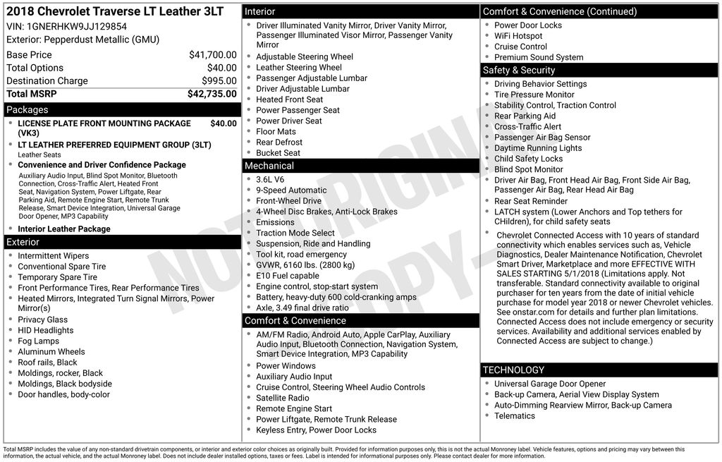 This 2018 Chevrolet Traverse 3LT is a sophisticated and capable family hauler that delivers exceptional comfort, convenience, and performance. Powered by a robust 3.6L V6 engine paired with a smooth-shifting 9-speed automatic transmission, the Traverse offers an impressive blend of power and efficiency, with an EPA-estimated 27 MPG on the highway.