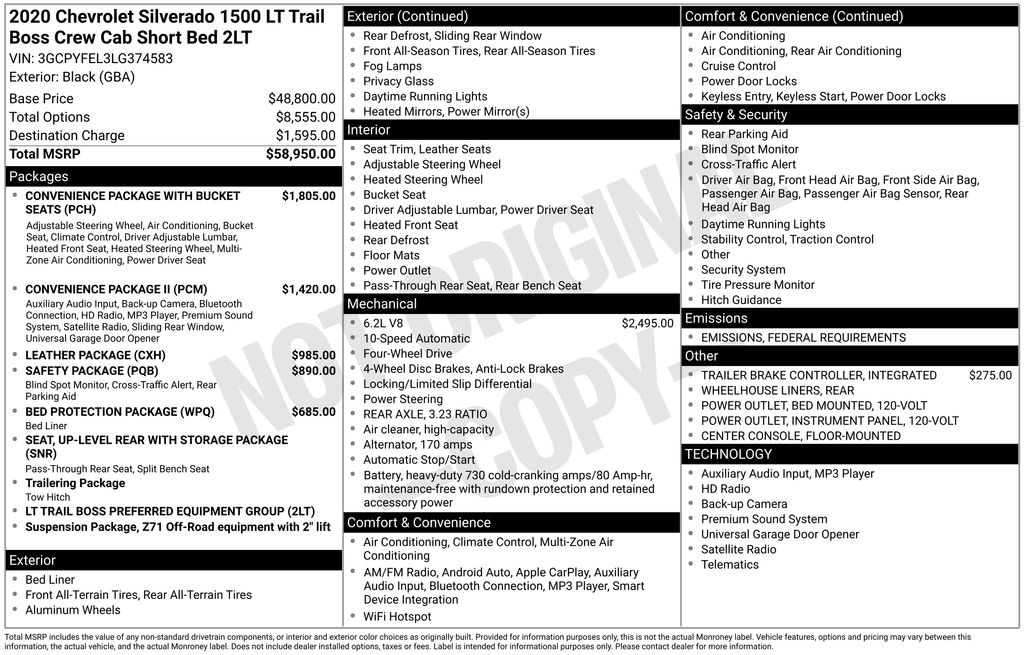10-Speed Automatic, 4WD, Black Leather, 10-Way Power Driver Seat w/Lumbar, 12-Volt Rear Auxiliary Power Outlet, 120-Volt Bed Mounted Power Outlet, 120-Volt Instrument Panel Power Outlet, 170 Amps Alternator, 2 USB Ports, 2 USB Ports (First Row), 3.23 Rear Axle Ratio, 4-Way Manual Driver Seat Adjuster, 4-Wheel Disc Brakes, 4.2" Diagonal Color Display Driver Info Center, 40/20/40 Front Split-Bench Seat, 4G LTE Wi-Fi Hot Spot Capable, 6 Speakers, 6-Speaker Audio System, ABS brakes, Air Conditioning, All-Weather Floor Liner (LPO) (AAK), Alloy wheels, AM/FM radio: SiriusXM, Apple CarPlay/Android Auto, Auxiliary External Transmission Oil Cooler, Bed Protection Package, Bluetooth® For Phone, Brake assist, Chevrolet Connected Access Capable, Chevytec Spray-On Black Bedliner, Cloth Seat Trim, Color-Keyed Carpeting Floor Covering, Compass, Convenience Package II, Convenience Package w/Buckets Seats, Deep-Tinted Glass, Delay-off headlights, Driver door bin, Driver vanity mirror, Dual Exhaust w/Polished Outlets, Dual front impact airbags, Dual front side impact airbags, Dual-Zone Automatic Climate Control, Electric Rear-Window Defogger, Electrical Lock Control Steering Column, Electronic Stability Control, Floor Mounted Center Console, Front anti-roll bar, Front Bucket Seats, Front Center Armrest w/Storage, Front fog lights, Front LED Fog Lamps, Front reading lights, Front wheel independent suspension, Fully automatic headlights, HD Radio, HD Rear Vision Camera, Heated door mirrors, Heated Driver & Front Outboard Passenger Seats, Heated Steering Wheel, Heavy-Duty Rear Locking Differential, High Capacity Air Filter, High Gloss Black Grille, High Gloss Black Mirror Caps, Hill Descent Control, Hitch Guidance, Illuminated entry, Integrated Trailer Brake Controller, Keyless Open & Start, Lane Change Alert w/Side Blind Zone Alert, Leather Package, Leather Wrapped Steering Wheel, LED Cargo Area Lighting, LED Reflector Headlamps, Low tire pressure warning, Manual Tilt-Wheel Steering Column, Manual Tilt/Telescoping Steering Column, Occupant sensing airbag, Off-Road Suspension w/2" Lift, OnStar & Chevrolet Connected Services Capable, Outside temperature display, Overhead airbag, Overhead console, Panic alarm, Passenger door bin, Passenger vanity mirror, Perforated Leather-Appointed Front Seat Trim, Performance Red Recovery Hooks, Perimeter Lighting, Power Door Locks, Power door mirrors, Power Front Windows w/Driver Express Up/Down, Power Front Windows w/Passenger Express Down, Power Rear Windows w/Express Down, Power Sliding Rear Window w/Rear Defogger, Power steering, Power windows, Preferred Equipment Group 2LT, Premium Bose 7-Speaker Sound System, Radio data system, Radio: Chevrolet Infotainment 3 Plus System, Radio: Chevrolet Infotainment 3 System, Rear 60/40 Folding Bench Seat (Folds Up), Rear Cross Traffic Alert, Rear Dual USB Charging-Only Ports, Rear reading lights, Rear step bumper, Rear Vision Camera, Rear Wheelhouse Liners, Rear window defroster, Remote keyless entry, Remote Vehicle Starter System, Safety Package, Security system, Single-Zone Manual/Semi-Automatic Air Conditioning, SiriusXM w/360L, Speed control, Speed-sensing steering, Split folding rear seat, Steering Wheel Audio Controls, Steering wheel mounted audio controls, Steering Wheel Mounted Electronic Cruise Control, Suspension Package, Tachometer, Theft Deterrent System (Unauthorized Entry), Tilt steering wheel, Traction control, Trailering Package, Trip computer, Ultrasonic Front & Rear Park Assist, Universal Home Remote, Up-Level Rear Seat w/Storage Package, Variably intermittent wipers, Voltmeter, Wheels: 18" x 8.5" Black Painte