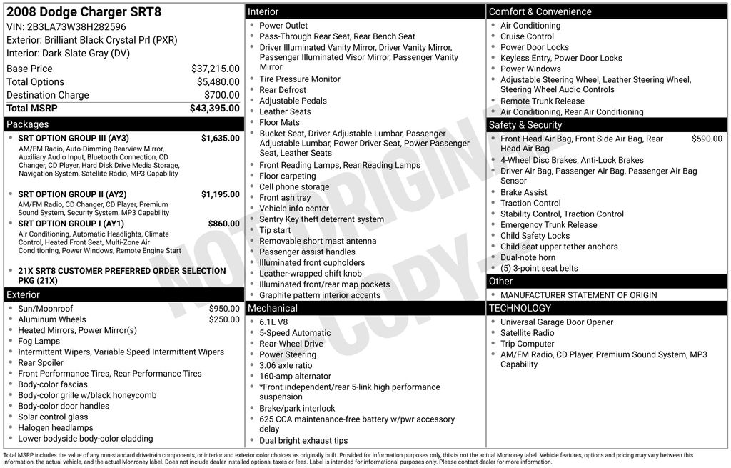 SRT HEMI 6.1L V8, Dark Slate Gray Leather, 13 SRT High Performance Kicker Audio Speakers, 20 x 9.0 Aluminum SRT Design Wheels, 20" x 9" SRT Design Aluminum Wheels, 200 Watt Kicker SRT Subwoofer, 322 Watt Kicker SRT Amplifier, 4-Wheel Disc Brakes, 6 Speakers, ABS brakes, Adjustable pedals, Air Conditioning, Air Conditioning w/Dual Zone ATC, Air Filtering, Alloy wheels, AM/FM CD/MP3 w/SIRIUS Satellite, AM/FM radio: SIRIUS, Automatic Headlamps, Brake assist, Bumpers: body-color, Call SIRIUS @ 888-539-7474 For Info, CD player, Compass, Delay-off headlights, Driver door bin, Driver vanity mirror, Dual front impact airbags, Electronic Stability Control, Four wheel independent suspension, Front & Rear Side Window Curtain Airbags, Front anti-roll bar, Front Bucket Seats, Front Center Armrest, Front fog lights, Front reading lights, Garage door transmitter, Heated door mirrors, Heated Front Seats, Illuminated entry, Instrument Cluster, Instrument Cluster w/Driver Surround Sound, Kicker Mobile Surround Sound System, Leather Shift Knob, Leather Trim Bucket Seats w/Preferred Suede, Low tire pressure warning, Manufacturer's Statement of Origin, MYGIG Multimedia System w/Navigation/SIRIUS, Navigation System w/GPS, Occupant sensing airbag, Outside temperature display, Overhead console, Panic alarm, Passenger door bin, Passenger vanity mirror, Power door mirrors, Power driver seat, Power Front Windows w/1-Touch Up & Down, Power passenger seat, Power steering, Power Sunroof, Power windows, Quick Order Package 21X, Radio data system, Rear anti-roll bar, Rear reading lights, Rear seat center armrest, Rear window defroster, Rear-View Auto-Dimming Mirror w/Microphone, Remote keyless entry, Remote Start System, Security Alarm, SIRIUS Satellite Radio, Speed control, Speed-Sensitive Wipers, Split folding rear seat, Spoiler, SRT Option Group I, SRT Option Group II, SRT Option Group III, Steering wheel mounted audio controls, Supplemental Front Seat Side Airbags, Supplemental Side Airbags, Tachometer, Telescoping steering wheel, Tilt steering wheel, Traction control, Trip computer, Uconnect Hands-Free Communication, Variably intermittent wipers, SRT HEMI 6.1L V8, Dark Slate Gray Leather.