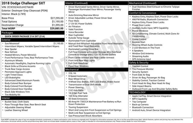 Panic alarm, ParkView Rear Back-Up Camera, Power Sunroof, Quick Order Package 21A SXT, Security system, Speed control, 4-Wheel Disc Brakes, 6 Speakers, ABS brakes, Air Conditioning, Alloy wheels, AM/FM radio, Anti-whiplash front head restraints, Apple CarPlay, Apple CarPlay/Android Auto, Auto-dimming Rear-View mirror, Automatic temperature control, Brake assist, Bumpers: body-color, Compass, Delay-off headlights, Driver door bin, Driver vanity mirror, Dual front impact airbags, Dual front side impact airbags, Electronic Stability Control, Four wheel independent suspension, Front anti-roll bar, Front Bucket Seats, Front Center Armrest, Front dual zone A/C, Front reading lights, Fully automatic headlights, Google Android Auto, GPS Antenna Input, Heated door mirrors, Houndstooth Cloth Sport Seats, Illuminated entry, Integrated Voice Command w/Bluetooth, Leather Shift Knob, Low tire pressure warning, Media Hub (2 USB, AUX), Outside temperature display, Overhead airbag, Overhead console, Passenger door bin, Passenger vanity mirror, Power door mirrors, Power driver seat, Power steering, Power windows, Radio data system, Radio: Uconnect 4 w/7" Display, Rear anti-roll bar, Rear reading lights, Rear seat center armrest, Rear window defroster, Remote keyless entry, Speed-sensing steering, Split folding rear seat, Spoiler, Steering wheel mounted audio controls, Tachometer, Telescoping steering wheel, Tilt steering wheel, Traction control, Trip computer, USB Host Flip, Variably intermittent wipers, Wheels: 18" x 7.5" Cast Aluminum, Panic alarm, ParkView Rear Back-Up Camera, Power Sunroof, Quick Order Package 21A SXT, Security system, Speed control.