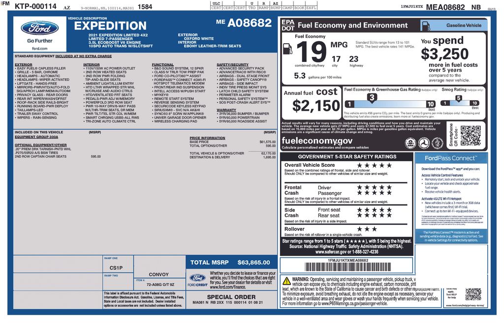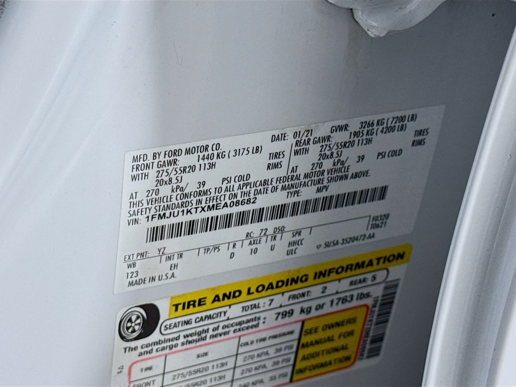 12 Speakers, 3.15 Axle Ratio, 3rd row seats: split-bench, 4-Wheel Disc Brakes, ABS brakes, Adjustable pedals, Air Conditioning, Alloy wheels, AM/FM radio: SiriusXM, Auto High-beam Headlights, Auto-dimming door mirrors, Auto-dimming Rear-View mirror, Automatic temperature control, Brake assist, Bumpers: body-color, Compass, Delay-off headlights, Driver door bin, Driver vanity mirror, Dual front impact airbags, Dual front side impact airbags, Electronic Stability Control, Emergency communication system: SYNC 3 911 Assist, Exterior Parking Camera Rear, Four wheel independent suspension, Front anti-roll bar, Front Bucket Seats, Front Center Armrest, Front dual zone A/C, Front fog lights, Front reading lights, Fully automatic headlights, Garage door transmitter, Heated & Ventilated Leather Front Captain's Chairs, Heated door mirrors, Heated front seats, Heated rear seats, Heated steering wheel, Illuminated entry, Leather steering wheel, Low tire pressure warning, Memory seat, Navigation System, Occupant sensing airbag, Outside temperature display, Overhead airbag, Overhead console, Panic alarm, Passenger door bin, Passenger vanity mirror, Pedal memory, Power door mirrors, Power driver seat, Power Liftgate, Power passenger seat, Power steering, Power windows, Radio data system, Radio: B&O Sound System by Bang & Olufsen, Rain sensing wipers, Rear air conditioning, Rear anti-roll bar, Rear audio controls, Rear reading lights, Rear window defroster, Rear window wiper, Reclining 3rd row seat, Remote keyless entry, Roof rack: rails only, Security system, SiriusXM Satellite Radio, Speed control, Speed-sensing steering, Speed-Sensitive Wipers, Split folding rear seat, Steering wheel memory, Steering wheel mounted audio controls, SYNC 3 Communications & Entertainment System, Tachometer, Telescoping steering wheel, Tilt steering wheel, Traction control, Trip computer, Turn signal indicator mirrors, Variably intermittent wipers, Ventilated front seats, Voltmeter, Wheels: 20" Premium Dark Tarnish-Painted.