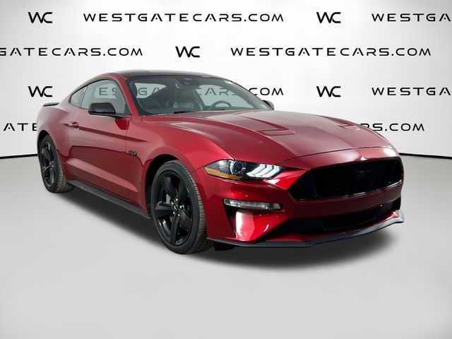 This stunning 2021 Ford Mustang GT Premium offers an exhilarating driving experience with its powerful 5.0L V8 engine, 10-speed automatic transmission, and rear-wheel-drive configuration. Boasting a sleek Rapid Red Metallic Tinted Clearcoat exterior, this Mustang is sure to turn heads wherever it goes. Highlighted by the Black Accent Package, it features a black rear spoiler, black mirror caps, and black GT, 5.0, and Pony badges, adding a bold and aggressive touch.