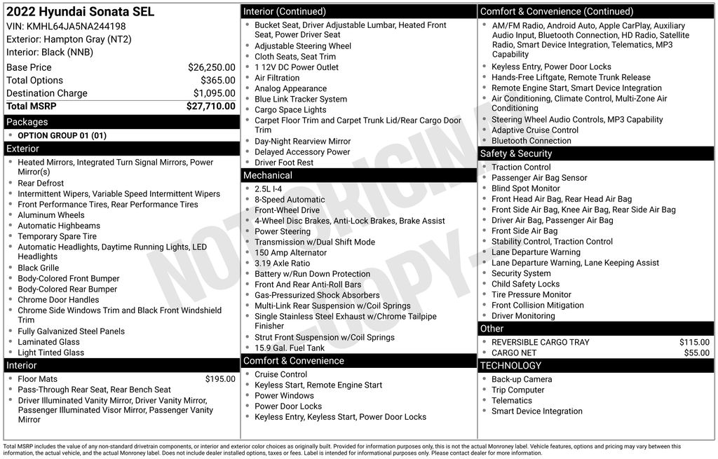 This 2022 Hyundai Sonata SEL is an exceptional value, combining dynamic performance, advanced technology, and a wealth of premium features. With its striking Gray exterior and well-appointed cabin, this Sonata is a standout in its class, offering a refined and engaging driving experience.