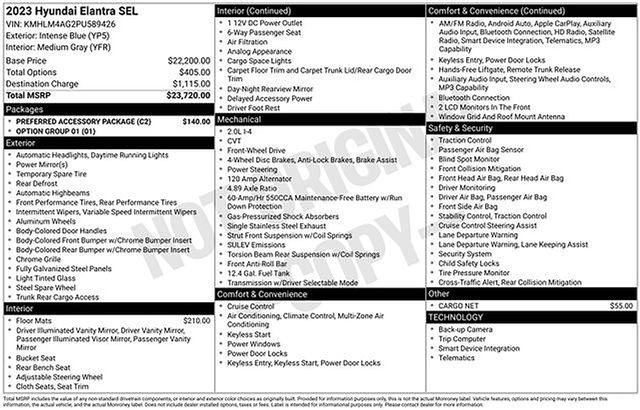 This 2023 Hyundai Elantra SEL is a standout choice for the savvy driver seeking a compact sedan packed with premium features. With its sleek blue exterior, efficient I4 engine, and impressive 30 city/40 highway MPG, this Elantra is the perfect blend of style and substance.