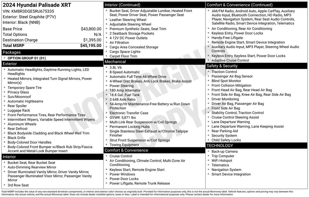 This 2024 Hyundai Palisade XRT is a remarkable SUV that combines style, capability, and advanced technology. With its sleek gray exterior and spacious interior, this Palisade is ready to take on your daily adventures with ease. The powerful V6 engine and all-wheel-drive system provide the perfect balance of performance and efficiency, delivering 19 city and 24 highway MPG.