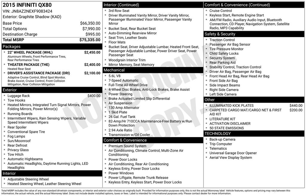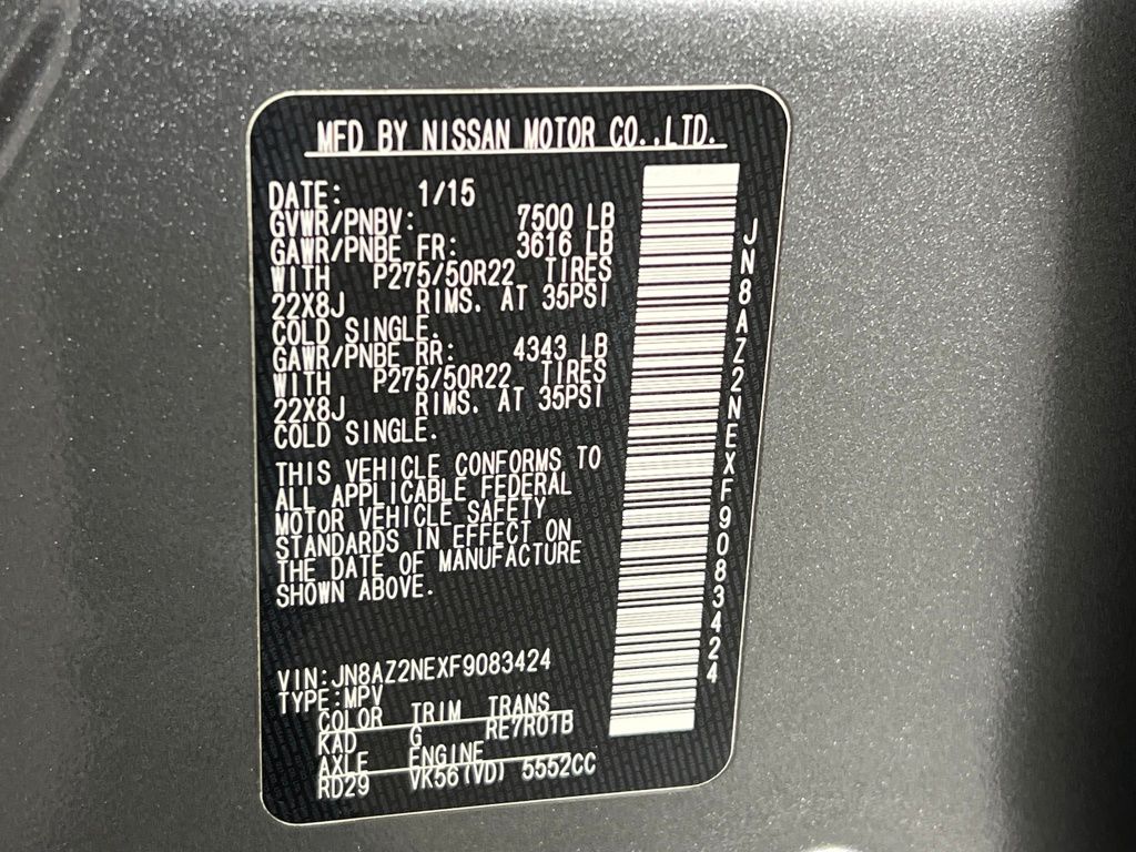 With its spacious interior, luxurious appointments, and impressive capabilities, this 2015 INFINITI QX80 Base is the perfect choice for those seeking a versatile and sophisticated SUV. Experience the ultimate in comfort, convenience, and performance â" schedule a test drive today and discover why this INFINITI is a cut above the rest.