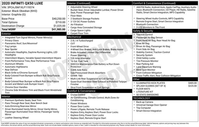 Whether you're looking for a stylish, feature-rich luxury crossover or a versatile family vehicle, this 2020 INFINITI QX50 LUXE is an exceptional choice. With a list price of $22,495, it represents incredible value in the pre-owned market.