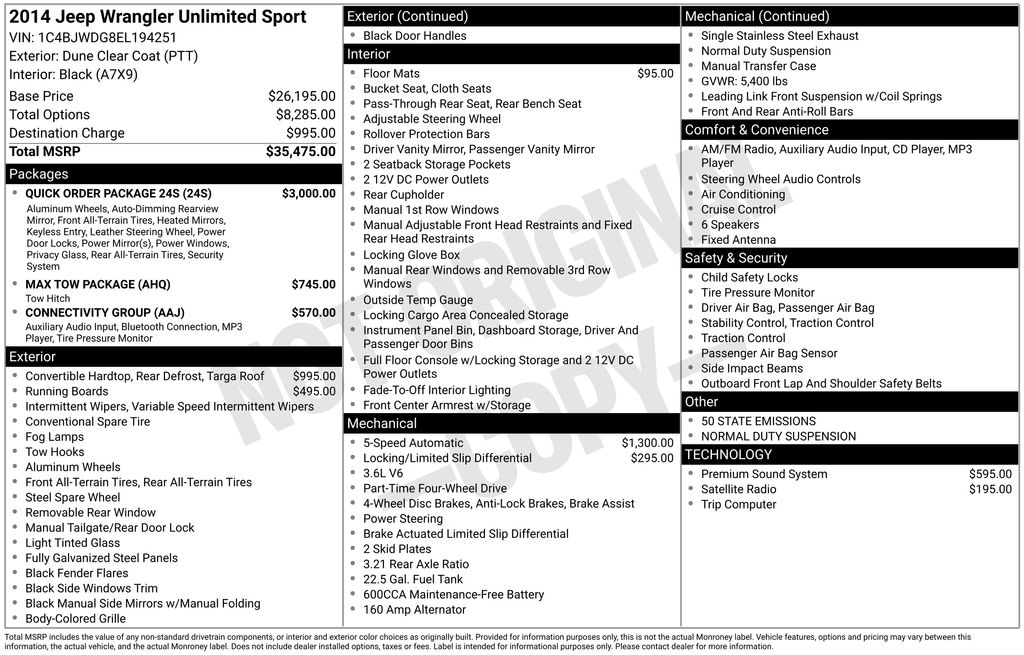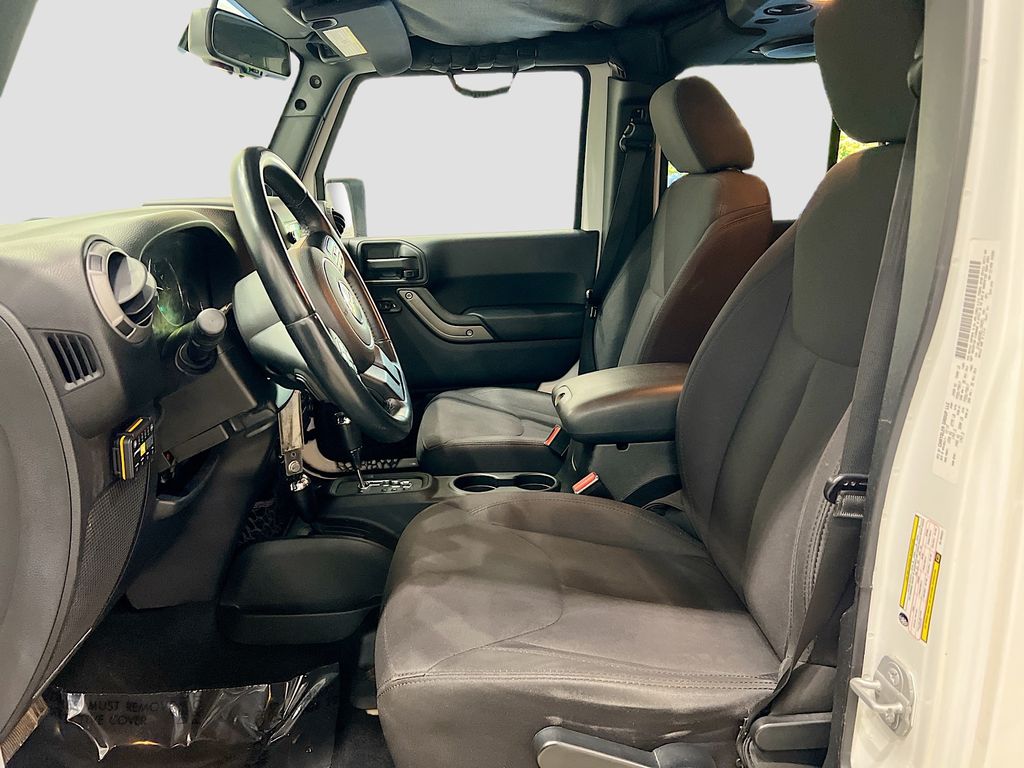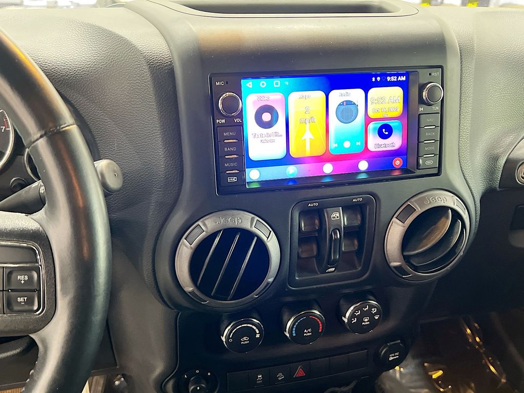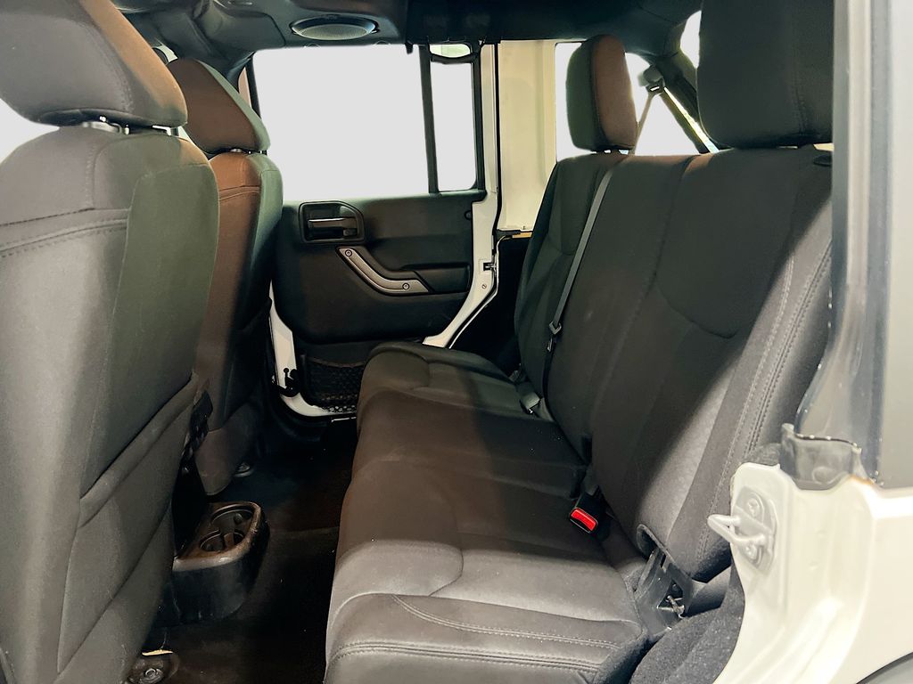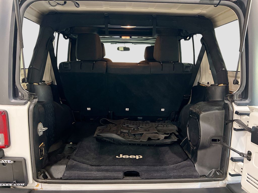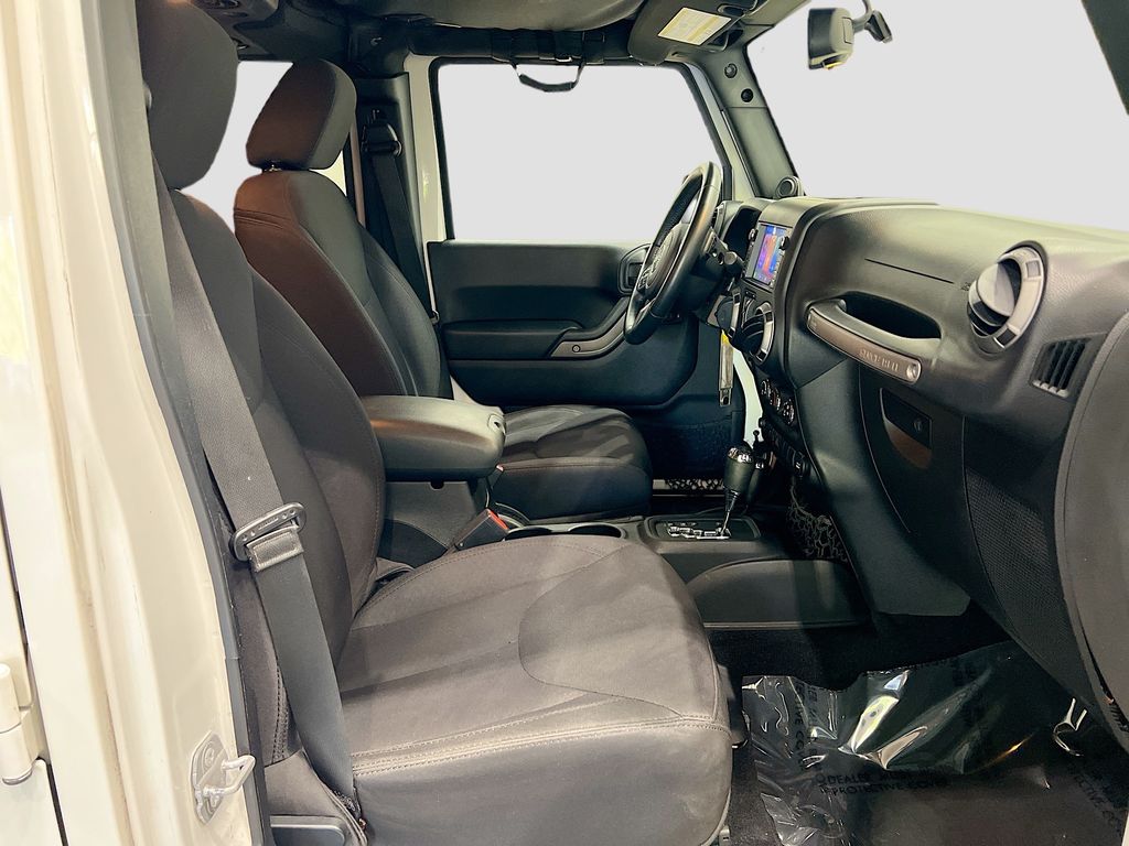 1-Year SIRIUSXM Radio Service, 16" x 7.0" Luxury Styled Steel Wheels, 17" x 7.5" Aluminum Wheels, 4-Wheel Disc Brakes, 6 Speakers, ABS brakes, Air Conditioning, Alpine Premium Audio System, AM/FM radio, Anti-Spin Differential Rear Axle, Auto-Dimming Mirror w/Reading Lamp, Black 3-Piece Hard Top, Brake assist, CD player, Chrome/Leather Wrapped Shift Knob, Class II Receiver Hitch, Cloth Bucket Seats, Compass, Connectivity Group, Deep Tint Sunscreen Windows, Delete Sunrider Soft Top, Driver door bin, Driver vanity mirror, Dual front impact airbags, Electronic Stability Control, Freedom Panel Storage Bag, Front 1-Touch Down Power Windows, Front anti-roll bar, Front Bucket Seats, Front Center Armrest w/Storage, Front fog lights, Integrated roll-over protection, Leather Wrapped Steering Wheel, Low tire pressure warning, Max Tow Package, MOPAR Slush Mats, Normal Duty Suspension, Occupant sensing airbag, Outside temperature display, Passenger door bin, Passenger vanity mirror, Power Heated Mirrors, Power Locks, Power steering, Quick Order Package 24S, Radio: Uconnect 130 AM/FM/CD/MP3, Rear anti-roll bar, Rear Window Defroster, Rear Window Wiper/Washer, Remote Keyless Entry, Remote USB Port, Security Alarm, SIRIUS Satellite Radio, Speed control, Split folding rear seat, Steering wheel mounted audio controls, Sunrider Soft Top, Tachometer, Tilt steering wheel, Tinted Rear Quarter & Liftgate Windows, Tire Pressure Monitoring Display, Traction control, Trailer Tow w/4-Pin Connector Wiring, Trip computer, Tubular Side Steps, Uconnect Voice Command w/Bluetooth, Variably intermittent wipers, Vehicle Information Center.