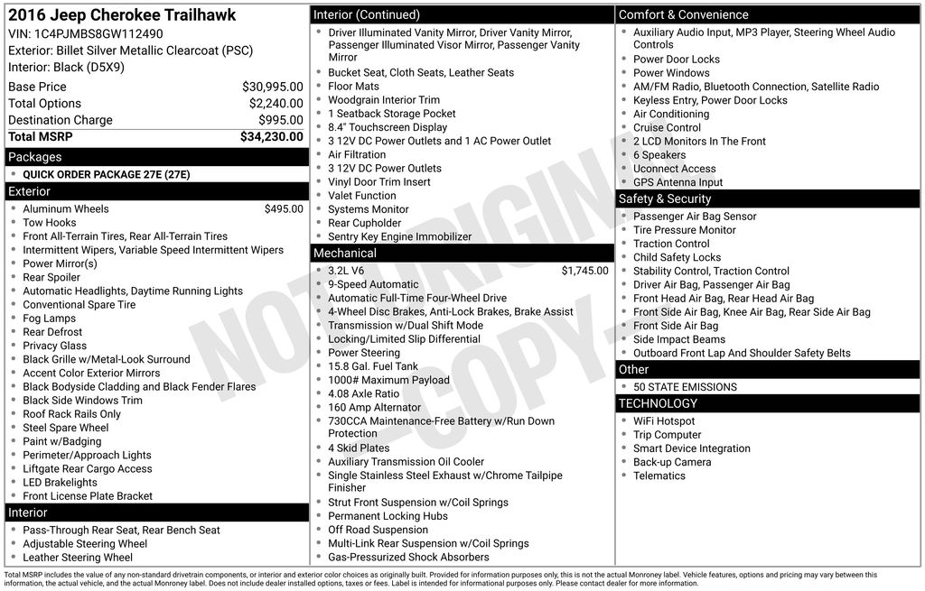 17" x 7.5" Aluminum Wheels, 4-Wheel Disc Brakes, 6 Speakers, 8.4" Touchscreen Display, ABS brakes, Accent Color Exterior Mirrors, Air Conditioning, Alloy wheels, AM/FM radio: SiriusXM, Anti-whiplash front head restraints, Auxiliary Transmission Oil Cooler, Brake assist, Cloth/Leather/Vinyl Bucket Seats, Compass, Delay-off headlights, Driver door bin, Driver vanity mirror, Dual front impact airbags, Dual front side impact airbags, Electronic Stability Control, Emergency communication system, Engine Oil Cooler, Four wheel independent suspension, Front anti-roll bar, Front Bucket Seats, Front Center Armrest, Front fog lights, Front reading lights, Fully automatic headlights, GPS Antenna Input, Illuminated entry, Integrated Voice Command w/Bluetooth, Knee airbag, Leather Shift Knob, Low tire pressure warning, Occupant sensing airbag, Off Road Suspension, Outside temperature display, Overhead airbag, Overhead console, Panic alarm, ParkView Rear Back-Up Camera, Passenger door bin, Passenger vanity mirror, Power door mirrors, Power steering, Power windows, Quick Order Package 27E, Radio data system, Radio: Uconnect 8.4, Rear anti-roll bar, Rear reading lights, Rear seat center armrest, Rear side impact airbag, Rear window defroster, Rear window wiper, Remote keyless entry, Roof rack: rails only, Speed control, Speed-sensing steering, Split folding rear seat, Spoiler, Steering wheel mounted audio controls, Tachometer, Telescoping steering wheel, Tilt steering wheel, Traction control, Trip computer, Uconnect Access, Variably intermittent wipers, Voltmeter, Wheels: 17" x 7.5" Black Painted Aluminum.