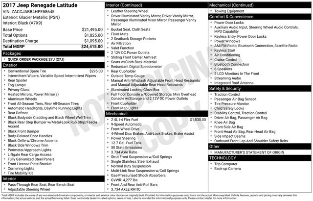 Equipped with a host of premium features, this Renegade Latitude offers unparalleled convenience and comfort. The Uconnect 3 infotainment system with a 5-inch display keeps you connected and entertained, while the 17-inch aluminum wheels and roof rails add a touch of style and utility. Safety is also a top priority, with advanced features like a ParkView Rear Back-Up Camera, Electronic Stability Control, and a comprehensive airbag system providing you and your passengers with peace of mind.
