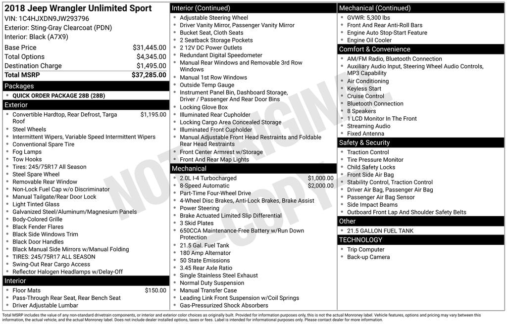 Whether you're seeking a capable off-road companion or a stylish daily driver, this 2018 Jeep Wrangler Unlimited Sport is an exceptional choice. With its winning combination of rugged performance, modern technology, and practical utility, this Wrangler is ready to elevate your driving experience.