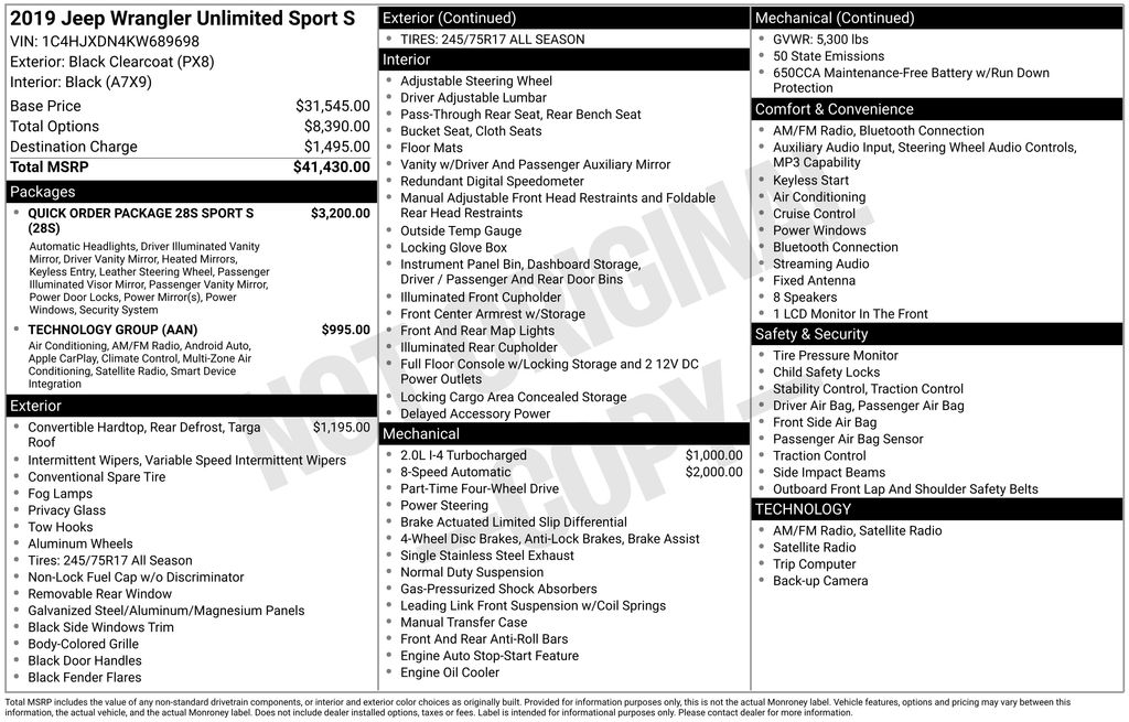Whether you're tackling the trails or cruising the city streets, this 2019 Jeep Wrangler Unlimited Sport S is ready to take you there in style and comfort. Experience the freedom and capability that only a Jeep can provide.