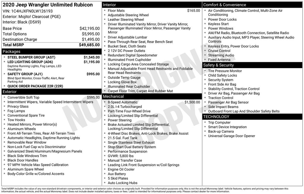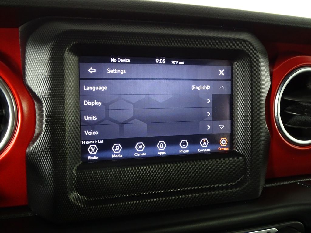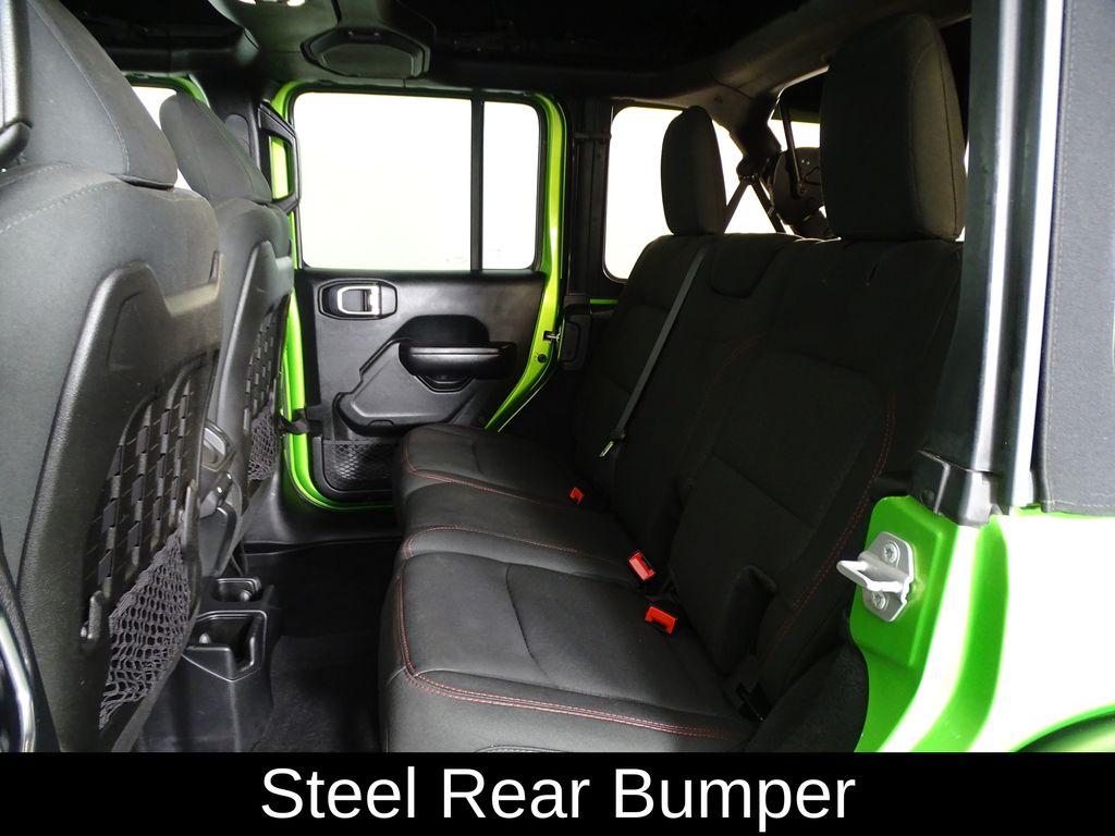 Blind Spot & Cross Path Detection, Daytime Running Lamps LED Accents, Front LED Fog Lamps, LED Lighting Group, LED Reflector Headlamps, LED Taillamps, ParkSense Rear Park Assist System, Quick Order Package 22R, Safety Group, Steel Bumper Group, Steel Front Bumper, Steel Rear Bumper, 4-Wheel Disc Brakes, 4.10 Rear Axle Ratio, 8 Speakers, ABS brakes, Air Conditioning, Alloy wheels, AM/FM radio: SiriusXM, Apple CarPlay/Android Auto, Automatic temperature control, Aux Battery, BF Goodrich Brand Tires, Brake assist, Compass, Delay-off headlights, Driver door bin, Driver vanity mirror, Dual front impact airbags, Dual front side impact airbags, Electronic Stability Control, Front anti-roll bar, Front Bucket Seats, Front Center Armrest w/Storage, Front dual zone A/C, Front fog lights, Front reading lights, Fully automatic headlights, Garage door transmitter, Heated door mirrors, Illuminated entry, Integrated roll-over protection, Leather steering wheel, Low tire pressure warning, MOPAR All-Weather Floor Mats (DISC), Non-Lock Fuel Cap w/o Discriminator, Occupant sensing airbag, Outside temperature display, Panic alarm, ParkView Rear Back-Up Camera, Passenger door bin, Passenger vanity mirror, Performance Suspension, Power door mirrors, Power steering, Power windows, Premium Black Sunrider Soft Top, Premium Cloth Low-Back Bucket Seats, Radio data system, Radio: Uconnect 4 w/7" Display, Rear anti-roll bar, Rear reading lights, Remote keyless entry, Security system, Speed control, Split folding rear seat, Steering wheel mounted audio controls, Stop-Start Dual Battery System, Tachometer, Telescoping steering wheel, Tilt steering wheel, Traction control, Trip computer, Variably intermittent wipers, Voltmeter, Wheels: 17" x 7.5" Machined w/Black Pockets, Blind Spot & Cross Path Detection, Daytime Running Lamps LED Accents, Front LED Fog Lamps, LED Lighting Group, LED Reflector Headlamps, LED Taillamps, ParkSense Rear Park Assist System, Quick Order Package 22R, Safety Group, Steel Bumper Group, Steel Front Bumper, Steel Rear Bumper.