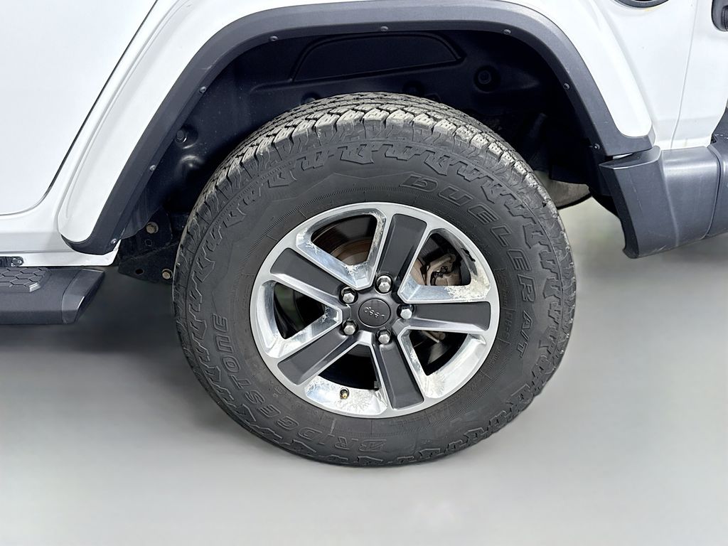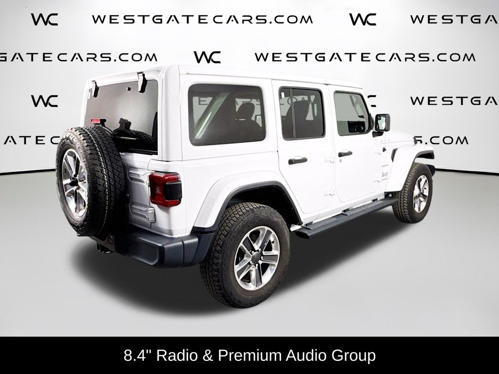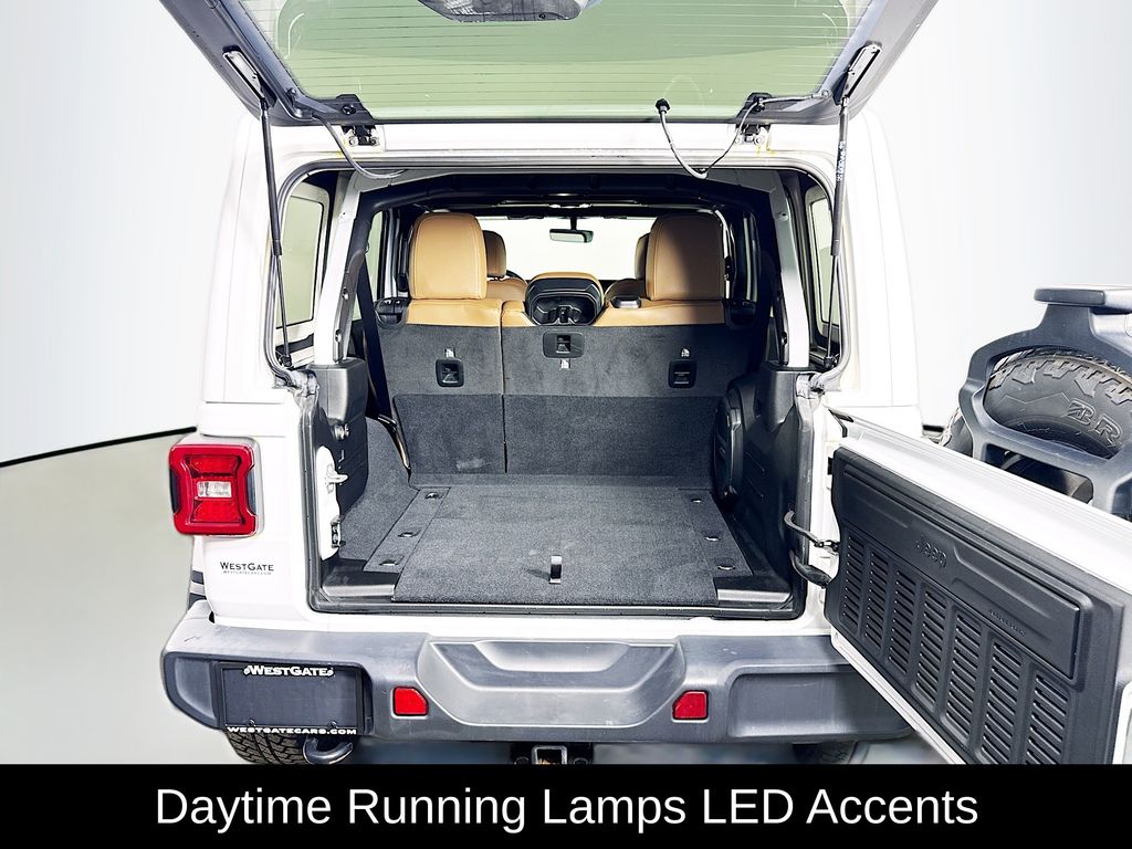 The exterior of this Wrangler Unlimited Sahara exudes a bold, confident style, with a striking white paint finish and the iconic Jeep seven-slot grille. The body-color hardtop provides a sleek, integrated look and can be easily removed for open-air driving. LED lighting elements, including daytime running lamps, fog lights, and taillamps, enhance both the aesthetic and functional capabilities of this vehicle.