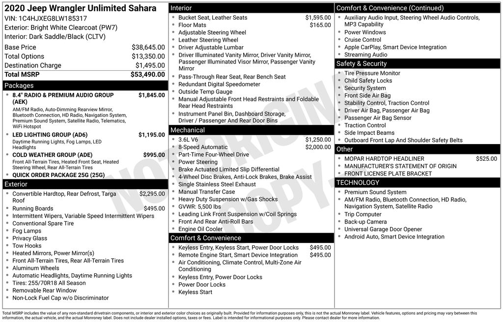 This Wrangler Unlimited Sahara is equipped with a comprehensive suite of advanced safety and technology features, including a rearview camera, electronic stability control, and a host of airbags. The Cold Weather Group and LED Lighting Group add even more functionality and capability, making this Jeep the perfect companion for your next adventure.