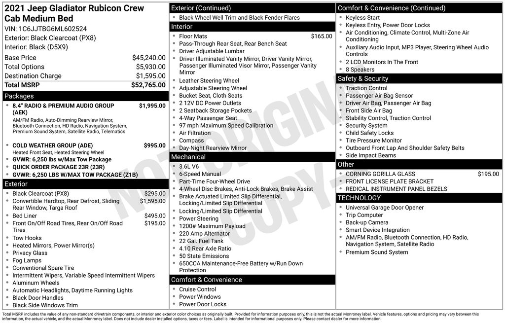 This 2021 Jeep Gladiator Rubicon is a true off-road legend, built to conquer the toughest terrain with uncompromising capability. Powered by a robust 3.6L V6 engine mated to a 6-speed manual transmission, this Gladiator delivers exceptional 4WD performance and impressive fuel efficiency. The rugged yet refined exterior features a striking Black Clearcoat paint job, accented by a bold Westin bed cap, Orafol vinyl wrap, and oversized off-road tires for an aggressive, adventure-ready look.