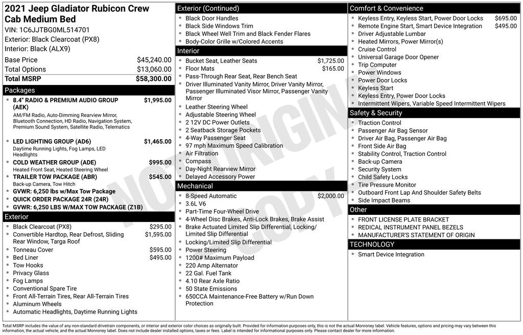 1-Year SiriusXM Guardian Trial, 240 Amp Alternator, 5-Year SiriusXM Traffic Service, 5-Year SiriusXM Travel Link Service, 8.4" Radio & Premium Audio Group, 8.4" Touchscreen Display, Alpine Premium Audio System, Auto-Dimming Rear-View Mirror, Class IV Hitch Receiver, Cold Weather Group, Daytime Running Lamps LED Accents, Emergency/Assistance Call, For Details, Visit DriveUconnect.com, Front LED Fog Lamps, GPS Navigation, GVWR: 6,250 lbs w/Max Tow Package, HD Radio, Heated Front Seats, Heated Steering Wheel, Heavy-Duty Engine Cooling, LED Lighting Group, LED Park Turn Lamps, LED Premium Reflector Headlamps, LED Taillamps, Quick Order Package 24R, Radio: Uconnect 4C Nav w/8.4" Display, SiriusXM Traffic Plus, SiriusXM Travel Link, Trailer Hitch Zoom, Trailer Tow Package, 4-Wheel Disc Brakes, 4.10 Rear Axle Ratio, 8 Speakers, 97 mph Maximum Speed Calibration, ABS brakes, Air Conditioning, Alloy wheels, AM/FM radio: SiriusXM, Apple CarPlay/Android Auto, Automatic temperature control, Black 3-Piece Hard Top, Brake assist, Compass, Delay-off headlights, Driver door bin, Driver vanity mirror, Dual front impact airbags, Dual front side impact airbags, Electronic Stability Control, Freedom Panel Storage Bag, Front anti-roll bar, Front Bucket Seats, Front Center Armrest w/Storage, Front dual zone A/C, Front fog lights, Front License Plate Bracket, Front reading lights, Fully automatic headlights, Garage door transmitter, Heated door mirrors, Illuminated entry, Integrated roll-over protection, Leather steering wheel, Low tire pressure warning, Manufacturer's Statement of Origin, MOPAR All-Weather Floor Mats (DISC), MOPAR Spray In Bedliner, Occupant sensing airbag, Outside temperature display, Panic alarm, ParkView Rear Back-Up Camera, Passenger door bin, Passenger vanity mirror, Performance Suspension, Power door mirrors, Power steering, Power windows, Premium Cloth Low-Back Bucket Seats, Radio data system, Radio: Uconnect 4 w/7" Display, Rear anti-roll bar, Rear reading lights, Rear Sliding Window, Rear Window Defroster, Redical Instrument Panel Bezels, Remote keyless entry, Remote Proximity Keyless Entry, Remote Start System, Roll-Up Tonneau Cover, Security system, Speed control, Split folding rear seat, Steering wheel mounted audio controls, Tachometer, Telescoping steering wheel, Tilt steering wheel, Traction control, Trip computer, Variably intermittent wipers, Voltmeter, Wheels: 17" x 7.5" Granite Crystal Aluminum, 1-Year SiriusXM Guardian Trial, 240 Amp Alternator, 5-Year SiriusXM Traffic Service, 5-Year SiriusXM Travel Link Service, 8.4" Radio & Premium Audio Group, 8.4" Touchscreen Display, Alpine Premium Audio System, Auto-Dimming Rear-View Mirror, Class IV Hitch Receiver, Cold Weather Group, Daytime Running Lamps LED Accents, Emergency/Assistance Call, For Details, Visit DriveUconnect.com, Front LED Fog Lamps, GPS Navigation, GVWR: 6,250 lbs w/Max Tow Package, HD Radio, Heated Front Seats, Heated Steering Wheel, Heavy-Duty Engine Cooling, LED Lighting Group, LED Park Turn Lamps, LED Premium Reflector Headlamps, LED Taillamps, Quick Order Package 24R, Radio: Uconnect 4C Nav w/8.4" Display, SiriusXM Traffic Plus, SiriusXM Travel Link, Trailer Hitch Zoom, Trailer Tow Package.