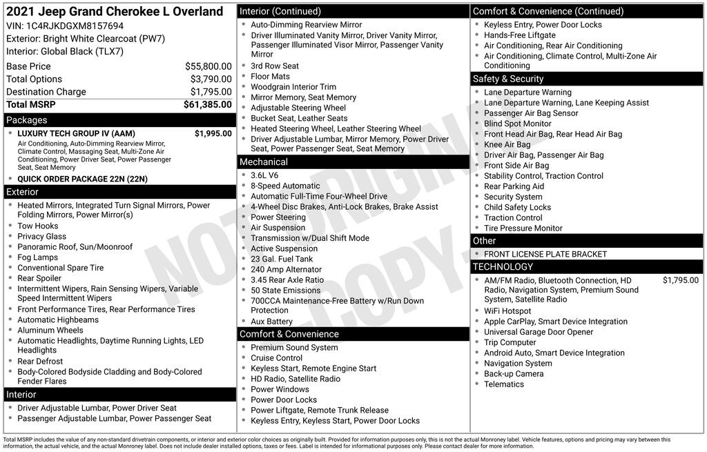 Step into luxury, capability, and style with this stunning 2021 Jeep Grand Cherokee L Overland 4WD! This SUV is the perfect blend of rugged Jeep performance and premium comfortplus it comes with a CLEAN CARFAX, is a CARFAX One-Owner, and has ONLY 45,000 miles!