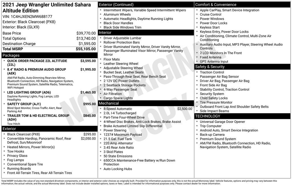 Adventure meets luxury in this 2021 Jeep Wrangler Unlimited Sahara Altitude! One owner, meticulously maintained, and packed with premium features including a matching hard top and One-Touch Sky Roof.