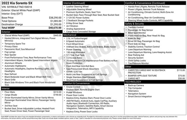 Elevate your driving experience with this stunning 2022 Kia Sorento SX. Packed with an impressive array of premium features, this SUV is ready to take your commute to new heights. Indulge in the comfort of adaptive cruise control, the convenience of a backup camera, and the added security of a blind spot monitoring system. Enjoy the open-air freedom of the panoramic sunroof and the refined elegance of leather seating.