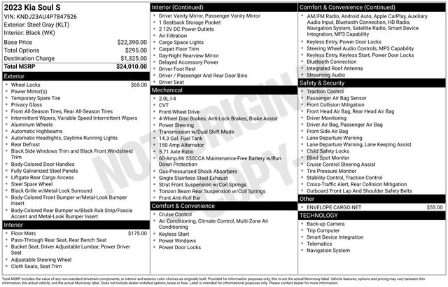 This 2023 Kia Soul S is a standout compact SUV that combines style, technology, and impressive efficiency. Packed with an array of premium features, this Soul S delivers an exceptional driving experience tailored to your needs.