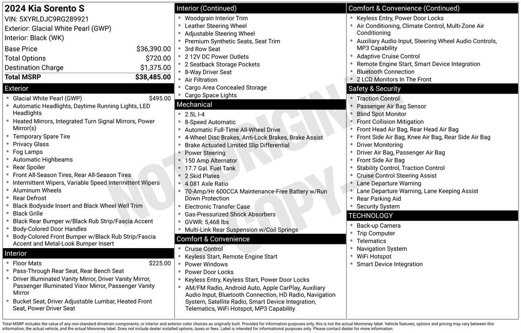 The 2024 Kia Sorento S offers a remarkable blend of style, capability, and technology that sets it apart from the competition. With its striking Glacial White Pearl exterior, this Sorento commands attention on the road, while its spacious and well-appointed cabin provides a premium driving experience.