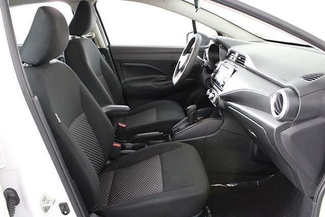 The stylish white exterior complements the well-appointed interior, which features comfortable cloth seating, power windows, and a user-friendly audio system with steering wheel-mounted controls. Convenient amenities like the rear window defroster, power door mirrors, and automatic headlights add to the Versa's everyday practicality.