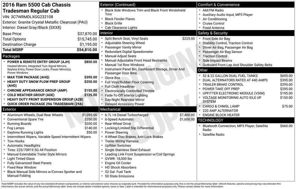 This 2016 Ram 5500HD Tradesman features a Cummins 6.7L I6 Turbodiesel engine, Aisin 6-Speed Automatic transmission, and rear-wheel drive. Highlights include: