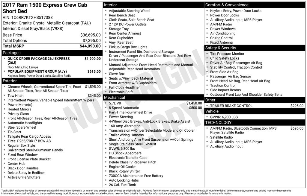 1-Yr SiriusXM Radio Service, 17" x 7" Aluminum Wheels, 17" x 7" Steel Wheels, 3.21 Rear Axle Ratio, 4-Wheel Disc Brakes, 40/20/40 Split Bench Seat, 5.0" Touchscreen Display, 6 Speakers, ABS brakes, Active Grille Shutters, Add Class IV Receiver Hitch, Air Conditioning, AM/FM radio, Audio Jack Input for Mobile Devices, Black Exterior Mirrors, Black Rotary Shifter, Body Color Front Fascia, Body Color Grille, Body Color Rear Bumper w/Step Pads, Brake assist, Carpet Floor Covering, Center Hub, Charge Only Remote USB Port, Cloth 40/20/40 Bench Seat, Delay-off headlights, Delete Class IV Receiver Hitch, Delete Spray In Bedliner, Driver door bin, Dual front impact airbags, Dual front side impact airbags, Dual Rear Exhaust w/Bright Tips, Electronic Shift, Electronic Stability Control, Exterior Mirrors w/Heating Element, Fog Lamps, For More Info, Call 800-643-2112, Front & Rear Floor Mats, Front anti-roll bar, Front Armrest w/3 Cupholders, Front Center Armrest, Front wheel independent suspension, Fully automatic headlights, GPS Antenna Input, Heated door mirrors, Heavy Duty Vinyl 40/20/40 Split Bench Seat, Integrated Voice Command w/Bluetooth, Low tire pressure warning, Media Hub (USB, AUX), No Satellite Coverage w/AK/HI/PR/VI, Occupant sensing airbag, Overhead airbag, Overhead Console, Passenger door bin, Popular Equipment Group, Power door mirrors, Power steering, Power windows, Quick Order Package 26J Express, Radio data system, Radio: Uconnect 3 w/5" Display, Radio: Uconnect 3.0, Ram 1500 Express, Rear anti-roll bar, Rear Folding Seat, Rear seat center armrest, Rear step bumper, Remote Keyless Entry w/All-Secure, Remote USB Port, SIRIUSXM Satellite Radio, Speed control, Storage Tray, Tachometer, Temperature & Compass Gauge, Tilt steering wheel, Tip Start, Traction control, Trailer Brake Control, Variably intermittent wipers, Voltmeter, Wheels: 20" x 9" Aluminum Chrome Clad.