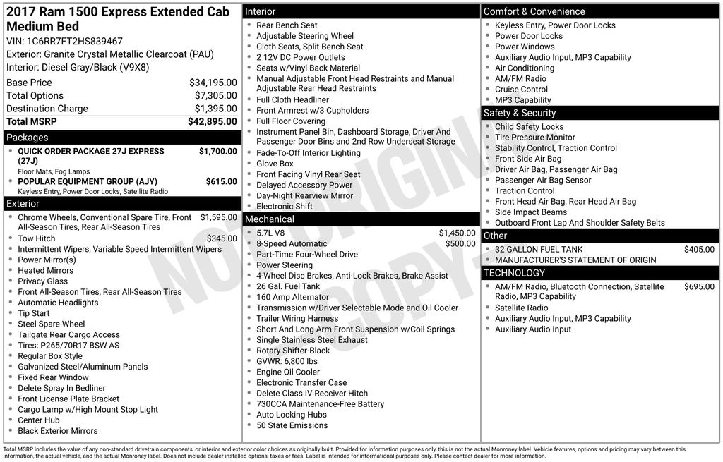 1-Year SiriusXM Radio Service, 17" x 7" Aluminum Wheels, 17" x 7" Steel Wheels, 3.21 Rear Axle Ratio, 32 Gallon Fuel Tank, 4-Wheel Disc Brakes, 40/20/40 Split Bench Seat, 5.0" Touchscreen Display, 6 Speakers, ABS brakes, Active Grille Shutters, Add Class IV Receiver Hitch, Air Conditioning, AM/FM radio, Audio Jack Input for Mobile Devices, Black Exterior Mirrors, Body Color Front Fascia, Body Color Grille, Body Color Rear Bumper w/Step Pads, Brake assist, Carpet Floor Covering, Center Hub, Charge Only Remote USB Port, Cloth 40/20/40 Bench Seat, Delay-off headlights, Delete Class IV Receiver Hitch, Delete Spray In Bedliner, Driver door bin, Dual front impact airbags, Dual front side impact airbags, Dual Rear Exhaust w/Bright Tips, Electronic Shift, Electronic Stability Control, Exterior Mirrors w/Heating Element, Fog Lamps, For More Info, Call 800-643-2112, Front & Rear Floor Mats, Front anti-roll bar, Front Armrest w/3 Cupholders, Front Center Armrest, Front wheel independent suspension, Fully automatic headlights, GPS Antenna Input, Heated door mirrors, Heavy Duty Vinyl 40/20/40 Split Bench Seat, Integrated Voice Command w/Bluetooth, Low tire pressure warning, Manufacturer's Statement of Origin, Media Hub (USB, AUX), No Satellite Coverage w/AK/HI/PR/VI, Occupant sensing airbag, Overhead airbag, Overhead Console, Passenger door bin, Popular Equipment Group, Power door mirrors, Power steering, Power windows, Quick Order Package 27J Express, Radio data system, Radio: 3.0, Radio: Uconnect 3 w/5" Display, Ram 1500 Express, Rear anti-roll bar, Rear Folding Seat, Rear step bumper, Remote Keyless Entry w/All-Secure, Remote USB Port, Rotary Shifter-Black, SiriusXM Satellite Radio, Speed control, Tachometer, Temperature & Compass Gauge, Tilt steering wheel, Tip Start, Traction control, Variably intermittent wipers, Voltmeter, Wheels: 20" x 9" Aluminum Chrome Clad.