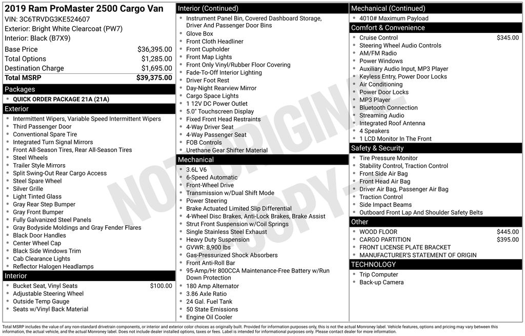 This 2019 Ram ProMaster 2500 High Roof is the versatile and capable work van you've been searching for. With its spacious 79,496-mile interior, powerful 3.6L V6 engine, and a long list of practical features, this ProMaster is ready to handle all your business needs with ease.