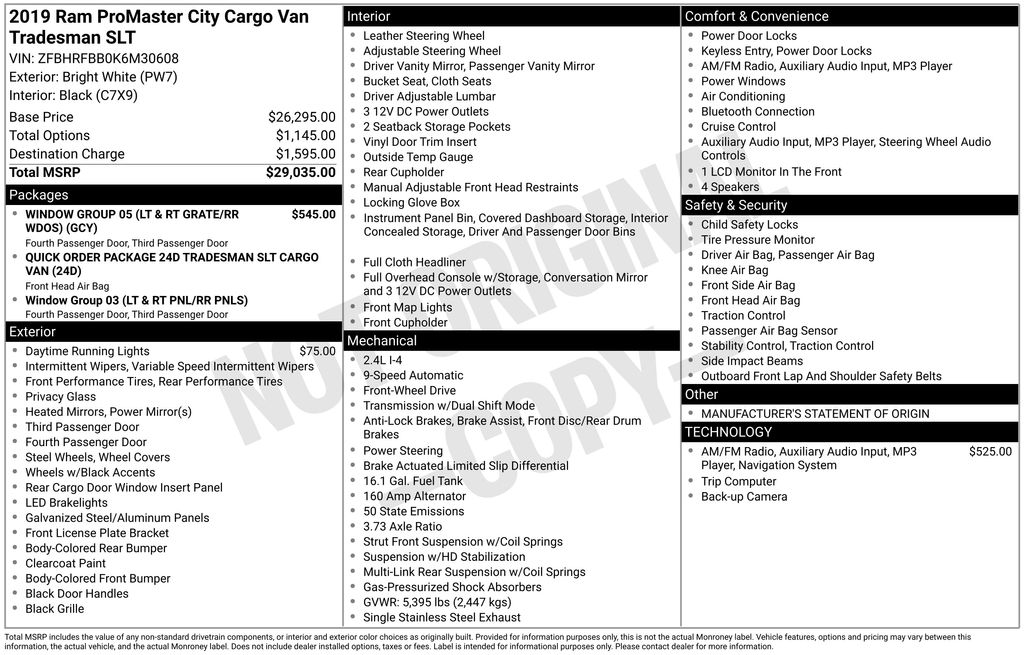 This 2019 Ram ProMaster City Tradesman SLT is a versatile and capable cargo van that's ready to take on any job. With its efficient 2.4L I4 MultiAir engine and 9-speed automatic transmission, it delivers an impressive 21 MPG in the city and 28 MPG on the highway, making it a smart choice for businesses and tradespeople who need to maximize their fuel economy.