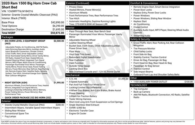 115V Auxiliary Power Outlet, 115V Auxiliary Rear Power Outlet, 2 USB Full Function/Charge Only Media Hub, 2nd Row In Floor Storage Bins, 3 Rear Seat Head Restraints, 4 Way Front Headrests, 400W Inverter, 6 Speakers, Air Conditioning ATC w/Dual Zone Control, Anti-Spin Differential Rear Axle, Auto-Dimming Exterior Driver Mirror, Auto-Dimming Rear-View Mirror, Big Horn Badge, Big Horn IP Badge, Big Horn Level 2 Equipment Group, Black Exterior Truck Badging, Black Headlamp Bezels, Black Interior Accents, Black Premium Power Mirrors, Body Color Door Handles, Body Color Exterior Mirrors, Body Color Front Bumper, Body Color Premium Power Mirrors, Body Color Rear Bumper w/Step Pads, Bucket Seats, Class IV Receiver Hitch, Dampened Tailgate, Deluxe Cloth Bucket Seats, Dual Exhaust w/Black Tips, Exterior Mirrors Courtesy Lamps, Exterior Mirrors w/Memory, Foam Bottle Insert (Door Trim Panel), Front Seat Back Map Pockets, Full Length Floor Console, Glove Box Lamp, Grille Surround 1 Black Texture 2 Black, Heated Front Seats, Heated Steering Wheel, Manual Adjust 4-Way Front Passenger Seat, Night Edition, ParkSense Front/Rear Park Assist w/Stop, Power 4-Way Driver Lumbar Adjust, Power 8-Way Driver Seat, Power Adjustable Pedals, Power-Folding Mirrors, Quick Order Package 25Z Big Horn, Radio: Uconnect 4 w/8.4" Display, Rear 60/40 Folding Seat, Rear Dome w/On/Off Switch Lamp, Rear Power Sliding Window, Rear Window Defroster, Security Alarm, SiriusXM Satellite Radio, Sun Visors w/Illuminated Vanity Mirrors, Universal Garage Door Opener, Wheels: 20" x 9.0" Premium Paint/Polished, 3.21 Rear Axle Ratio, 4-Wheel Disc Brakes, 48V Belt Starter Generator, ABS brakes, Air Conditioning, Alloy wheels, AM/FM radio, Brake assist, Bumpers: chrome, Cloth Bench Seat, Compass, Delay-off headlights, Driver door bin, Dual front impact airbags, Dual front side impact airbags, Electronic Stability Control, Front anti-roll bar, Front Center Armrest w/Storage, Front fog lights, Front reading lights, Front wheel independent suspension, Fully automatic headlights, GPS Antenna Input, Heated door mirrors, Illuminated entry, Leather steering wheel, Low tire pressure warning, Occupant sensing airbag, Outside temperature display, Overhead airbag, Overhead console, Panic alarm, ParkView Rear Back-Up Camera, Passenger door bin, Passenger vanity mirror, Power door mirrors, Power steering, Power windows, Radio data system, Radio: Uconnect 3 w/5" Display, Rear anti-roll bar, Rear seat center armrest, Rear step bumper, Remote keyless entry, Remote Start System, Speed control, Split folding rear seat, Steering wheel mounted audio controls, Tachometer, Telescoping steering wheel, Tilt steering wheel, Traction control, Trip computer, Variably intermittent wipers, Voltmeter, Wheels: 18" x 8" Cast-Aluminum Painted, 115V Auxiliary Power Outlet, 115V Auxiliary Rear Power Outlet, 2 USB Full Function/Charge Only Media Hub, 2nd Row In Floor Storage Bins, 3 Rear Seat Head Restraints, 4 Way Front Headrests, 400W Inverter, 6 Speakers, Air Conditioning ATC w/Dual Zone Control, Anti-Spin Differential Rear Axle, Auto-Dimming Exterior Driver Mirror, Auto-Dimming Rear-View Mirror, Big Horn Badge, Big Horn IP Badge, Big Horn Level 2 Equipment Group, Black Exterior Truck Badging, Black Headlamp Bezels, Black Interior Accents, Black Premium Power Mirrors, Body Color Door Handles, Body Color Exterior Mirrors, Body Color Front Bumper, Body Color Premium Power Mirrors, Body Color Rear Bumper w/Step Pads, Bucket Seats, Class IV Receiver Hitch, Dampened Tailgate, Deluxe Cloth Bucket Seats, Dual Exhaust w/Black Tips, Exterior Mirrors Courtesy Lamps, Exterior Mirrors w/Memory, Foam Bottle Insert (Door Trim Panel), Front Seat Back Map Pockets, Full Length Floor Console, Glove Box Lamp,
