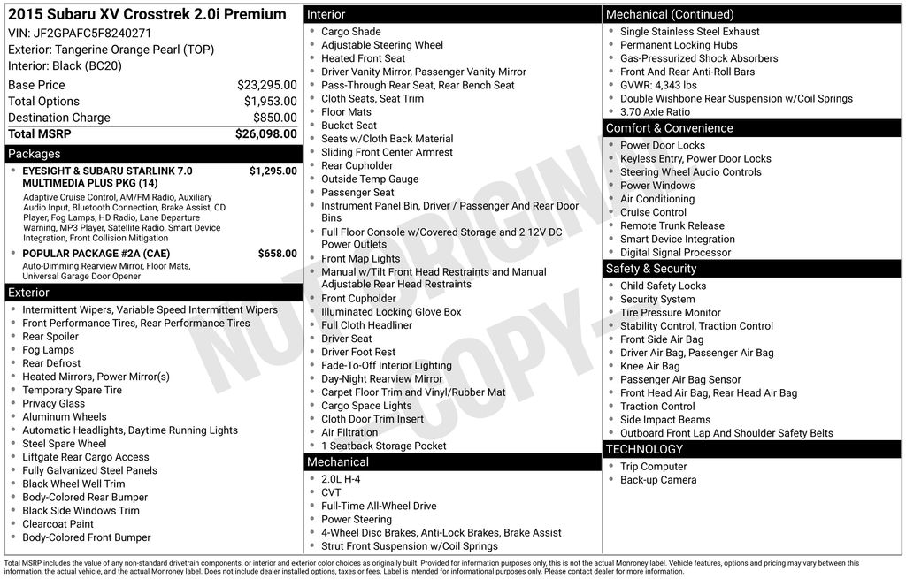 Whether you're tackling the daily commute or embarking on a weekend getaway, this Subaru XV Crosstrek 2.0i Premium is the perfect companion. Its impressive array of safety technologies, including the EyeSight driver assist system, provide added peace of mind on the road. And with the included Popular Package #2A, you'll enjoy premium features like an auto-dimming mirror, all-weather floor mats, and a rear bumper cover for enhanced protection.