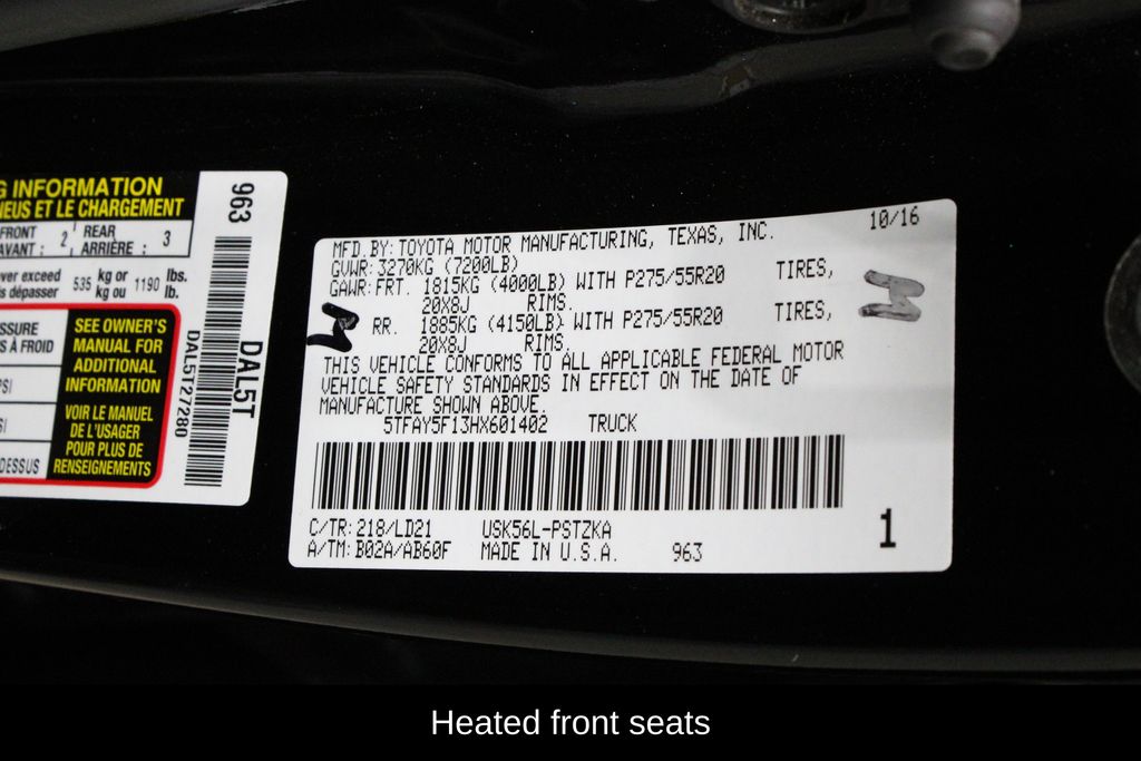 4WD, Sand Beige w/Leather Seat Trim (LB) or Leather Seat Trim w/TRD Off-Road Package, 1794 Grade Package, ABS brakes, Alloy wheels, Compass, Electronic Stability Control, Front dual zone A/C, Heated & Ventilated Front Bucket Seats, Heated door mirrors, Heated front seats, Illuminated entry, Low tire pressure warning, Navigation System, Power moonroof, Remote keyless entry, Traction control, Western Grade Package.
