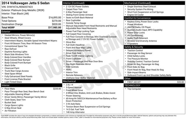 This 2014 Volkswagen Jetta 2.0L S is a well-equipped and efficient compact sedan that offers an exceptional driving experience. With its 2.0L I4 SOHC engine and 5-speed manual transmission, this Jetta delivers a responsive and engaging performance, while the front-wheel-drive configuration ensures confident handling on the road.
