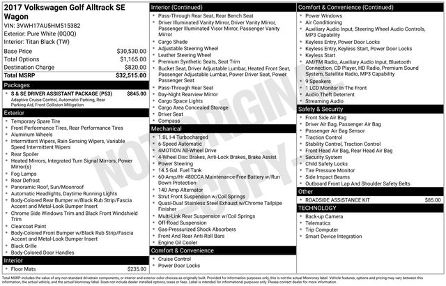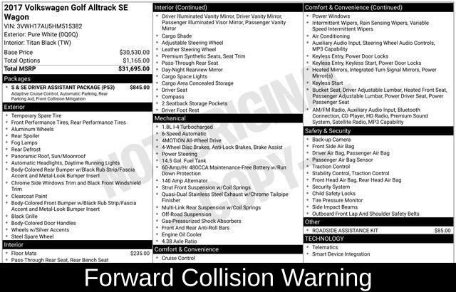 Elevate your driving experience with this 2017 Volkswagen Golf Alltrack TSI SE 4Motion. This versatile crossover blends the agility of a compact hatchback with the capability of an all-wheel-drive system, making it the perfect companion for your adventures. Powered by a turbocharged 1.8L engine and paired with a smooth-shifting 6-speed DSG automatic transmission, this Golf Alltrack delivers an impressive balance of performance and efficiency, with EPA-estimated ratings of 22 MPG in the city and 30 MPG on the highway.
