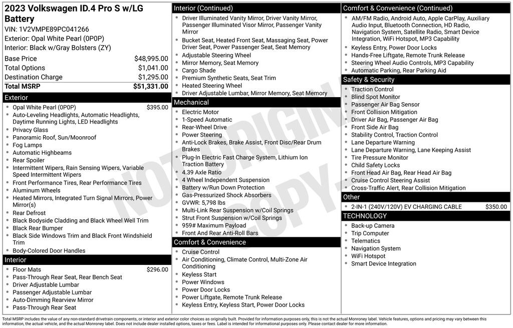 This exceptional 2023 Volkswagen ID.4 Pro S offers a captivating blend of style, technology, and performance. Painted in the striking Opal White Pearl exterior, this all-electric SUV commands attention with its sleek, modern design and impressive presence on the road.