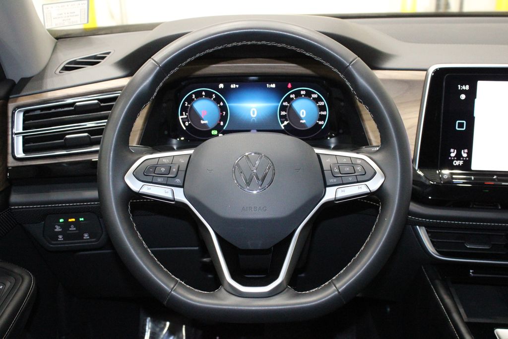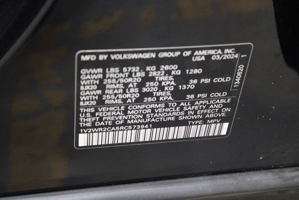 Automatic temperature control, Front dual zone A/C, Fully automatic headlights, Power driver seat, Power Liftgate, Steering wheel mounted audio controls, 3.60 Axle Ratio, 3rd row seats: split-bench, 4-Wheel Disc Brakes, 6 Speakers, ABS brakes, Air Conditioning, Alloy wheels, AM/FM radio: SiriusXM with 360L, Auto-dimming Rear-View mirror, Brake assist, Bumpers: body-color, Compass, Delay-off headlights, Driver door bin, Driver vanity mirror, Dual front impact airbags, Dual front side impact airbags, Electronic Stability Control, Emergency communication system: VW Car-Net Safe & Secure 5-year, Exterior Parking Camera Rear, Four wheel independent suspension, Front anti-roll bar, Front Bucket Seats, Front Center Armrest, Front fog lights, Front reading lights, Heated door mirrors, Heated front seats, Heated steering wheel, Heated/Actively Ventilated Front Bucket Seats, Illuminated entry, Low tire pressure warning, Occupant sensing airbag, Outside temperature display, Overhead airbag, Overhead console, Panic alarm, Passenger door bin, Passenger vanity mirror, Perforated V-Tex Leatherette Seating Surfaces, Power door mirrors, Power steering, Power windows, Radio data system, Radio: MIB3 Composition Media, Rain sensing wipers, Rear air conditioning, Rear anti-roll bar, Rear reading lights, Rear seat center armrest, Rear window defroster, Rear window wiper, Remote keyless entry, Security system, Speed control, Speed-sensing steering, Split folding rear seat, Spoiler, Standard Suspension, Tachometer, Telescoping steering wheel, Tilt steering wheel, Traction control, Trip computer, Turn signal indicator mirrors, Variably intermittent wipers, Ventilated front seats, Wheels: 20" 2-Tone Machined Alloy, Automatic temperature control, Front dual zone A/C, Fully automatic headlights, Power driver seat, Power Liftgate, Steering wheel mounted audio controls.